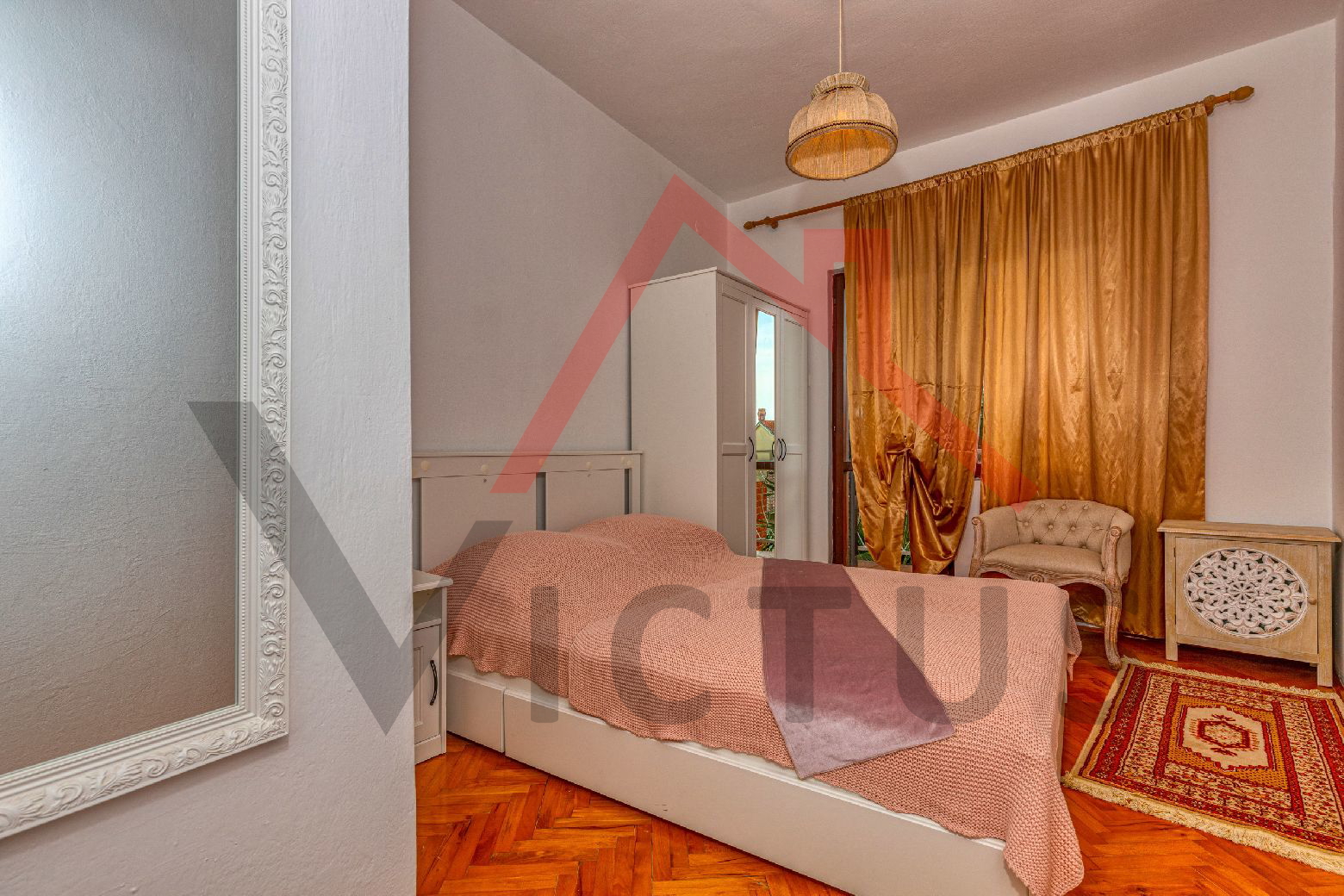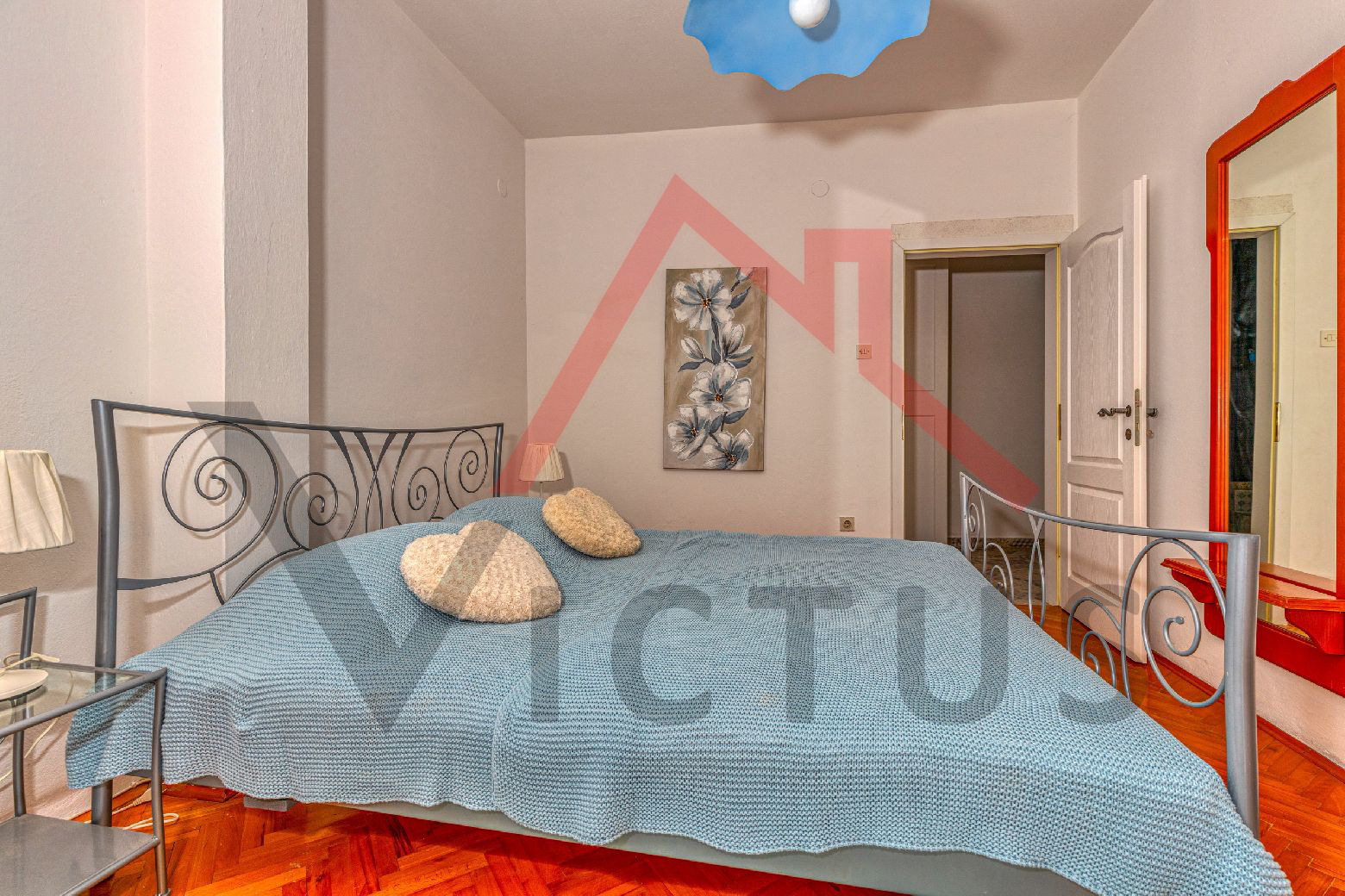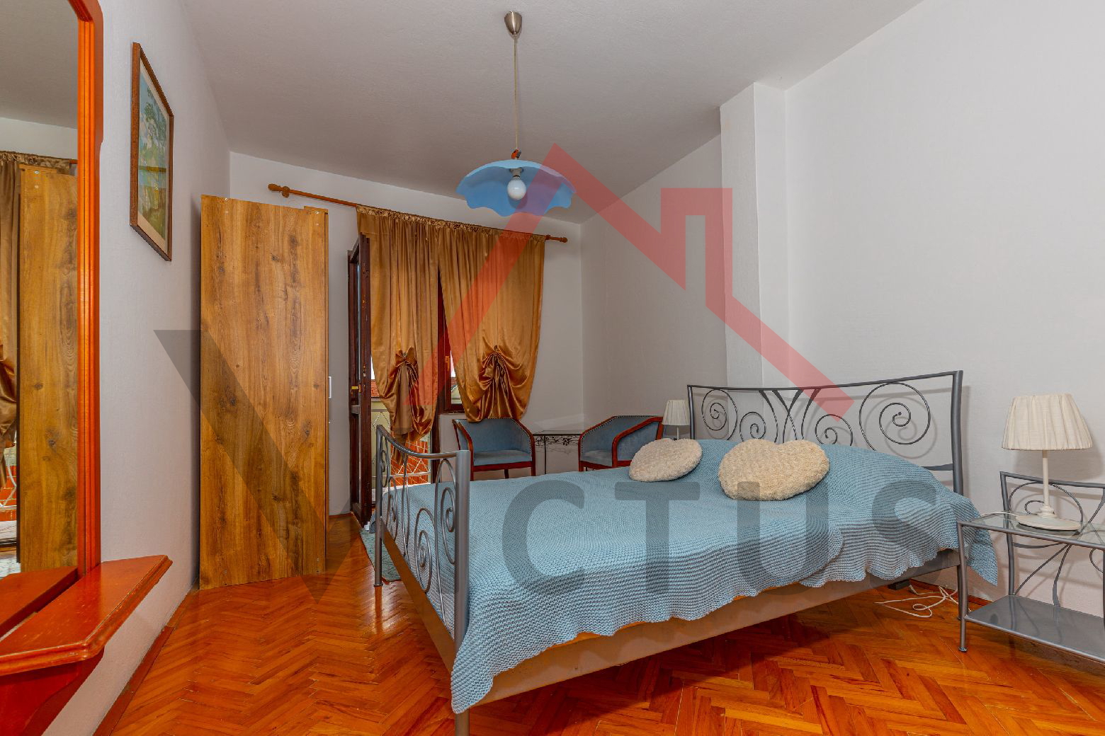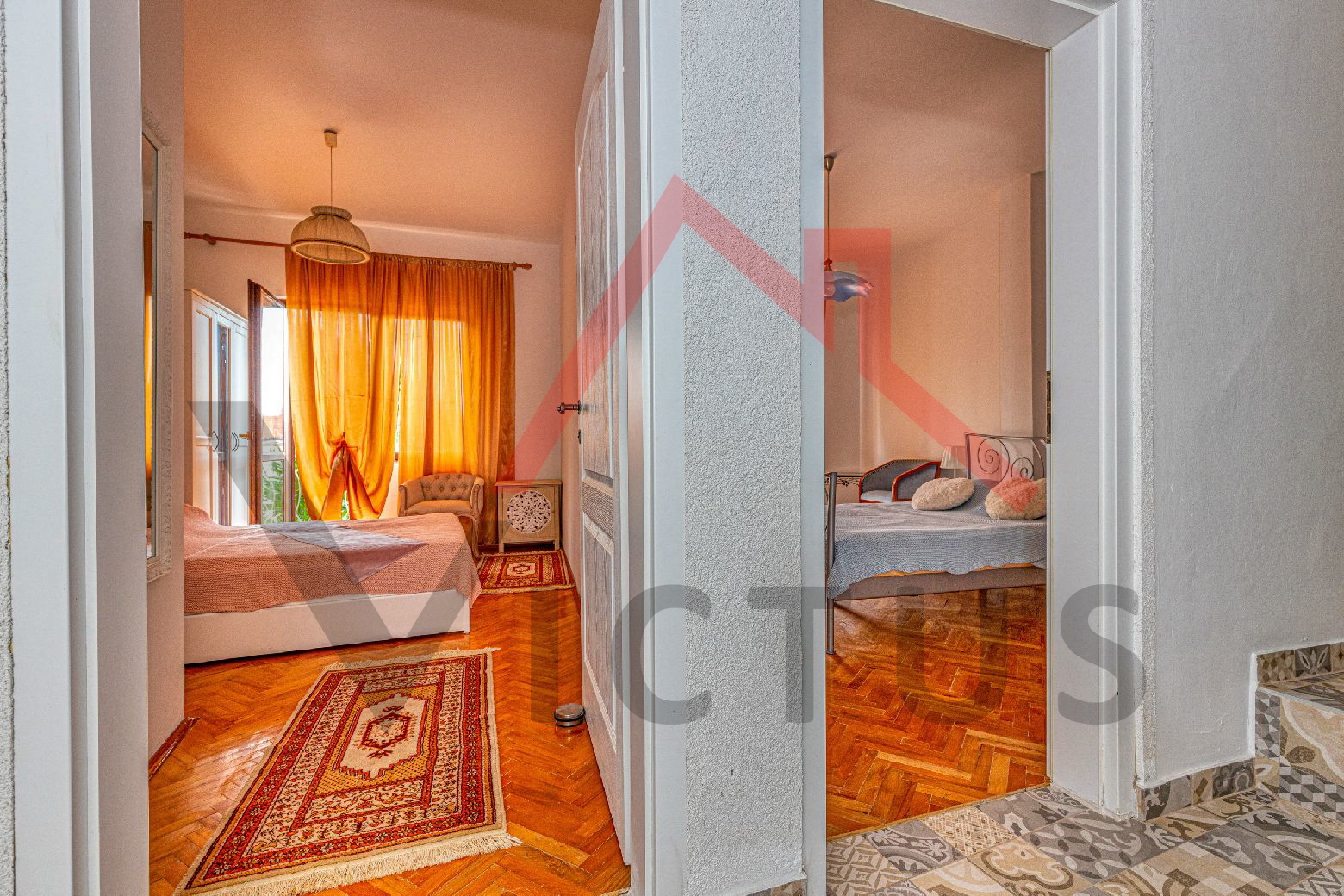 Das Haus besteht aus Erdgeschoss und Obergeschoss. Im Erdgeschoss befinden sich das Wohnzimmer, die Küche, das Badezimmer, eine Toilette und ein Abstellraum. Über eine Innentreppe gelangt man in das erste Obergeschoss, wo sich zwei Schlafzimmer befinden, beide mit Zugang zur großzügigen Terrasse. Das Haus ist von der Nord- und Südseite zugänglich, und im Hof befindet sich ein Nebengebäude mit Küche, Badezimmer und einem kleinen Zimmer. Ein Parkplatz befindet sich innerhalb des Hofes.