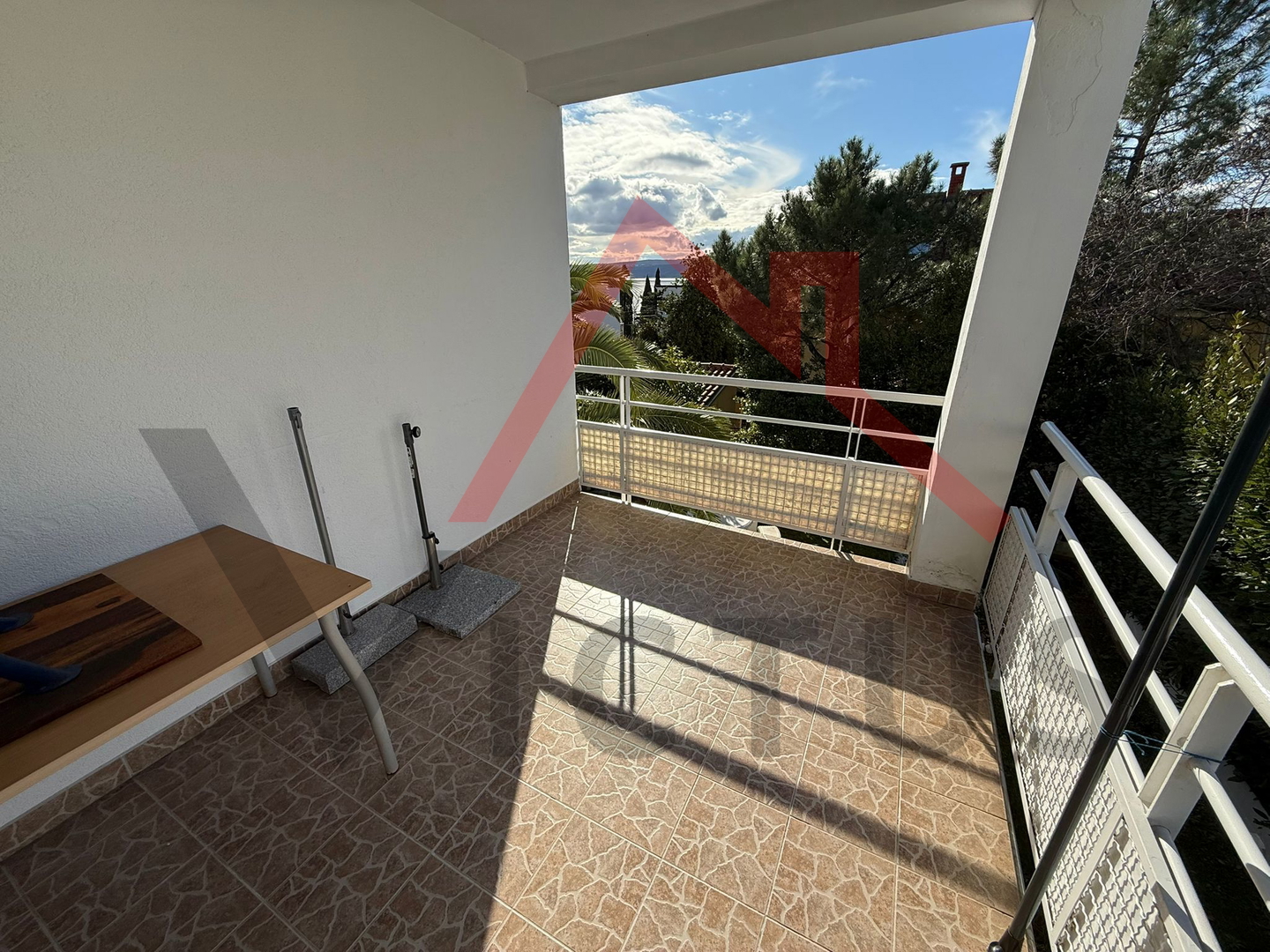 Die Wohnung befindet sich im ersten Stock eines Wohngebäudes, ist jedoch tatsächlich auf derselben Ebene wie der Eingang auf der Nordseite des Gebäudes. Die Wohnung besteht aus Küche, Wohnzimmer, zwei Schlafzimmern und einem Badezimmer. Zur Wohnung gehört eine überdachte Terrasse mit einer Fläche von 9 m2, von der aus ein teilweiser Meerblick geboten wird. Ein ausgewiesener Parkplatz befindet sich innerhalb des Grundstücks des Gebäudes.