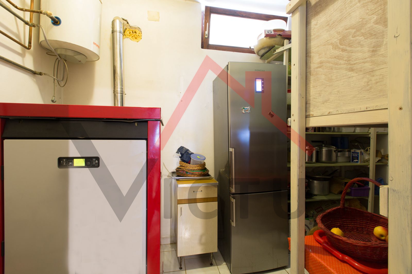 The ground floor, which includes a spacious living room, kitchen, storage room, and boiler room.