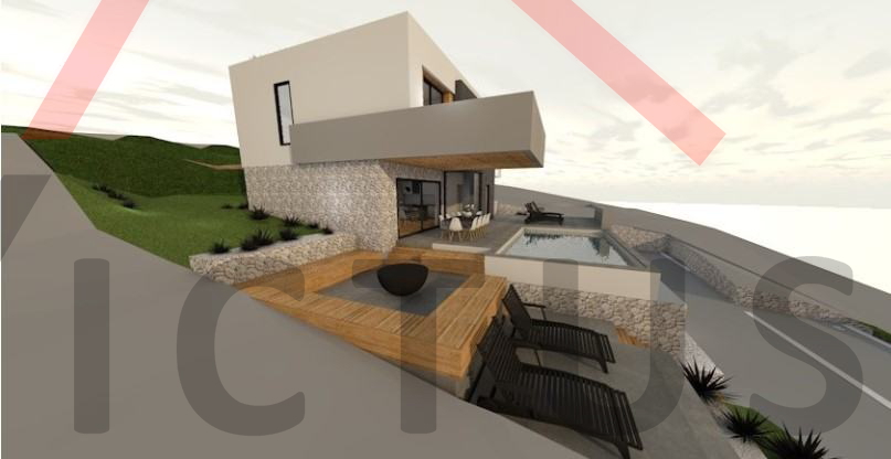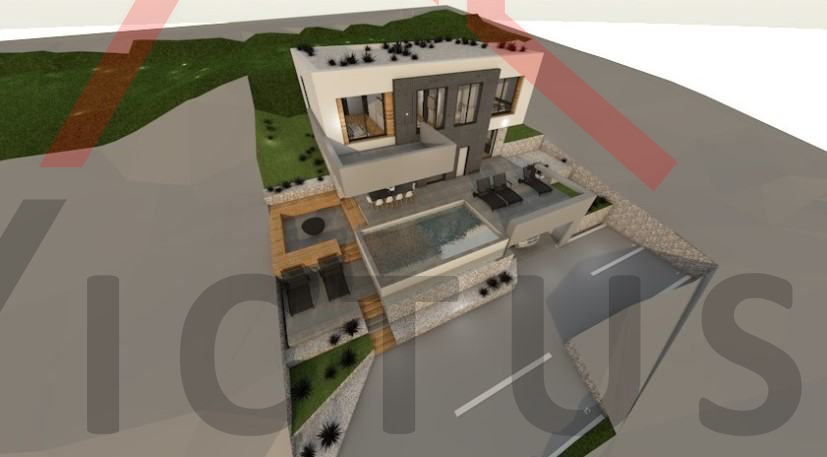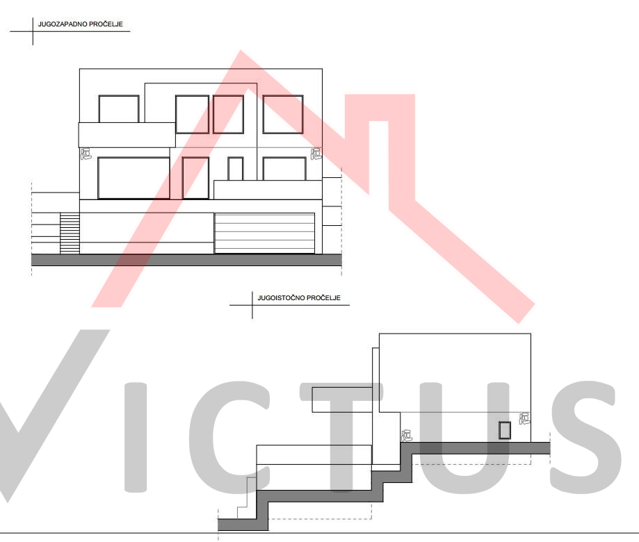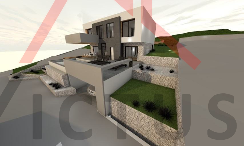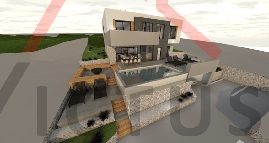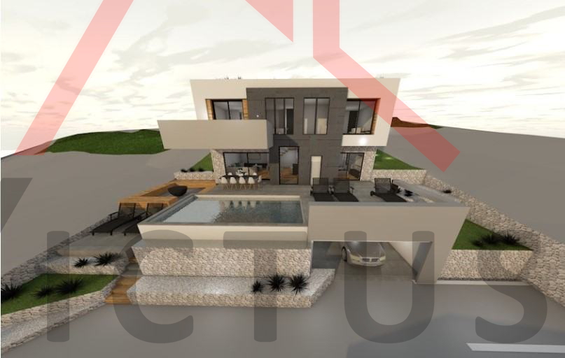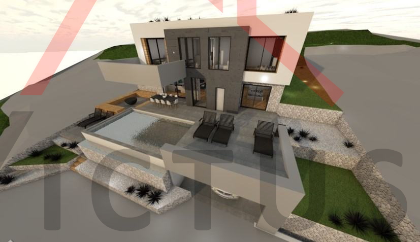 Zemljište površine 486 m2 se prodaje s projektom za samostojeću vilu na tri etaže s bazenom i krovnom terasom, te za koju je predan zahtjev za izdavanje građevinske dozvole. U cijenu ulazi zemljište van građevinske zone površine 298 m2, a koje je povezano s zemljištem građevinske namjene. Vila je neto stambene površine 218 m2, sa 5 spavaćih soba, svaka s vlasitom kupaonicom. Do zemljišta vodi asfaltirani prilaz. Prema projektu, raspored vile je sljedeći: