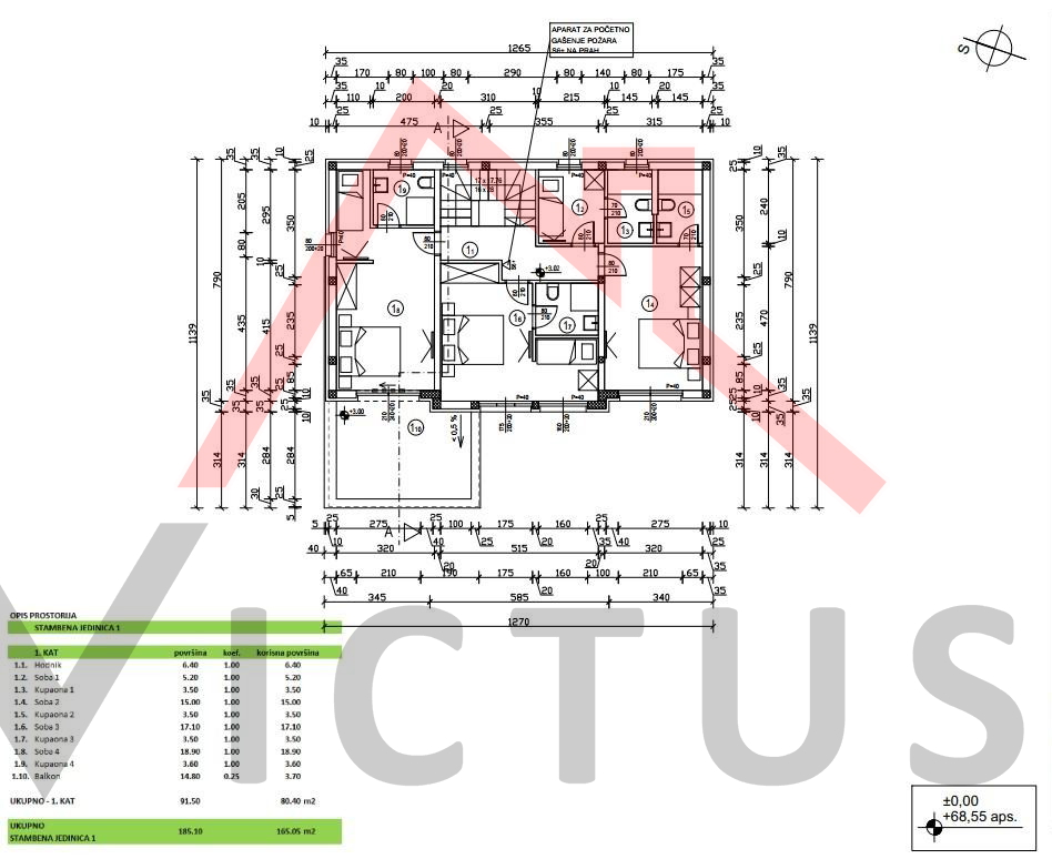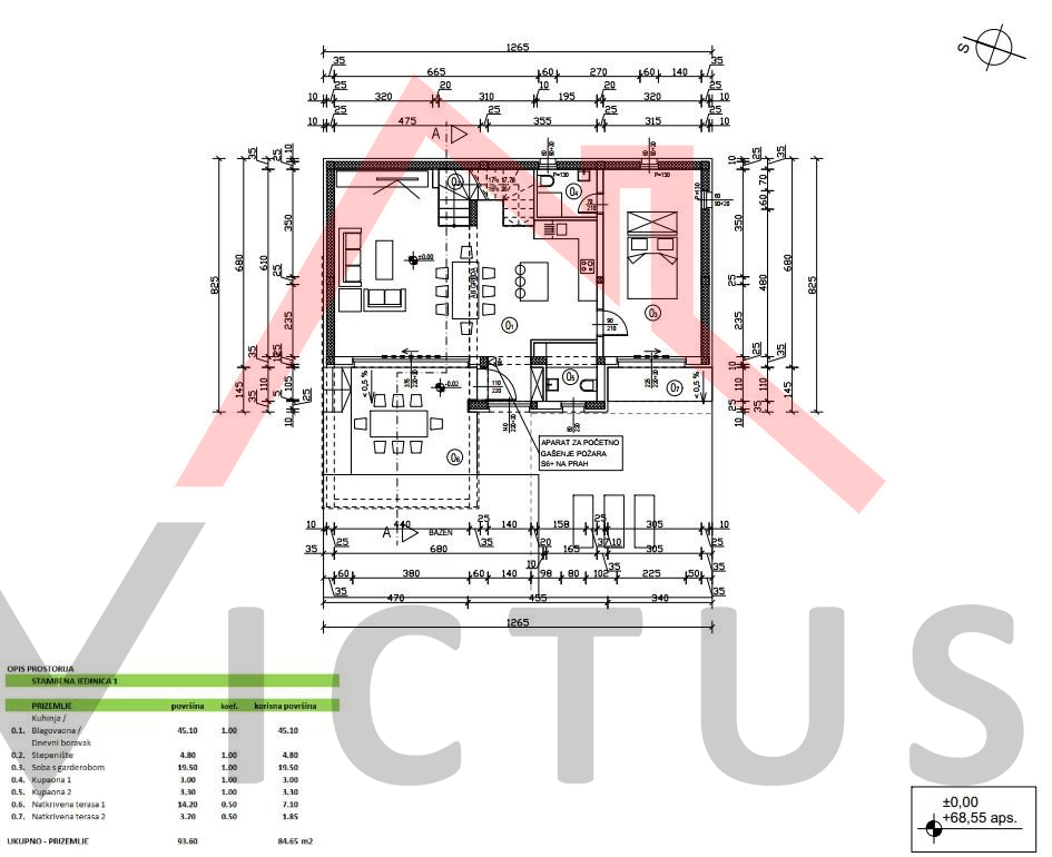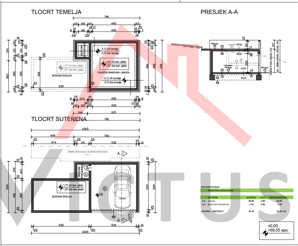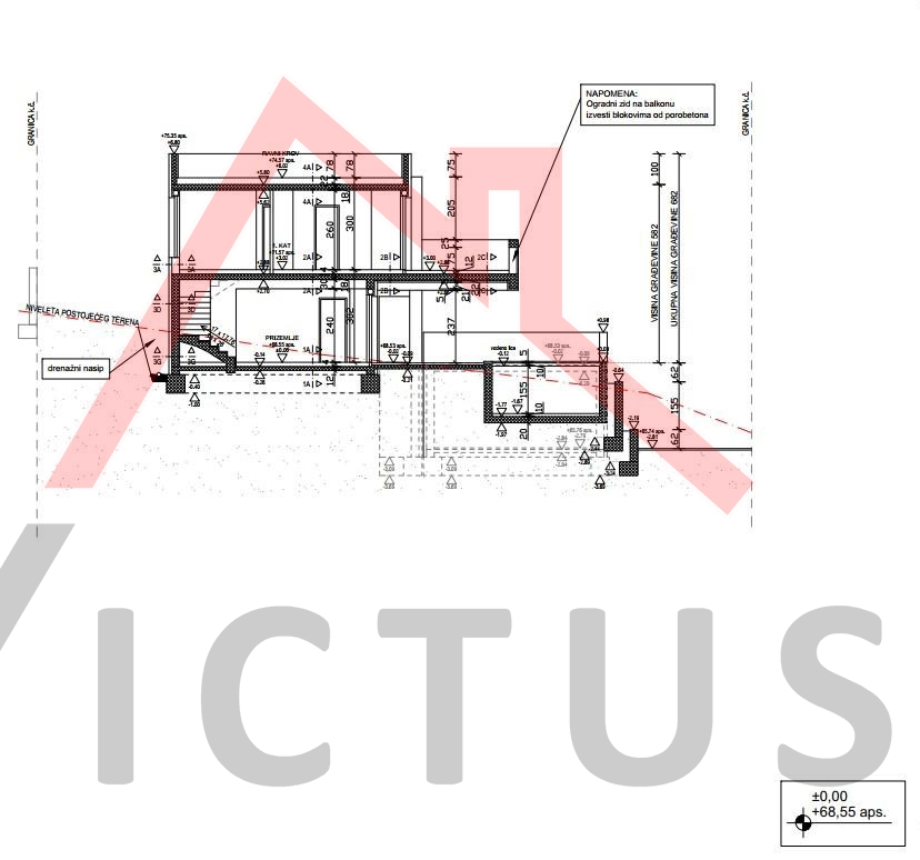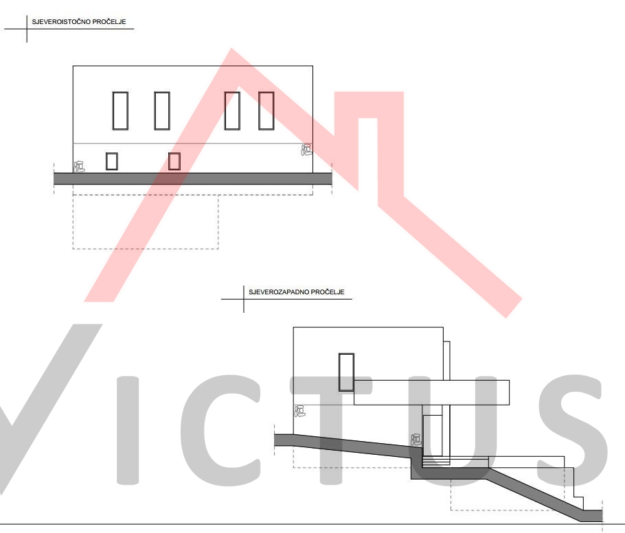 Zemljište površine 486 m2 se prodaje s projektom za samostojeću vilu na tri etaže s bazenom i krovnom terasom, te za koju je predan zahtjev za izdavanje građevinske dozvole. U cijenu ulazi zemljište van građevinske zone površine 298 m2, a koje je povezano s zemljištem građevinske namjene. Vila je neto stambene površine 218 m2, sa 5 spavaćih soba, svaka s vlasitom kupaonicom. Do zemljišta vodi asfaltirani prilaz. Prema projektu, raspored vile je sljedeći:
