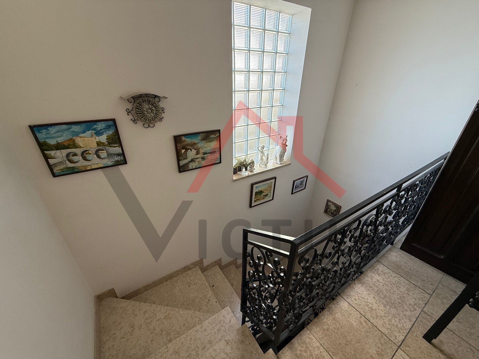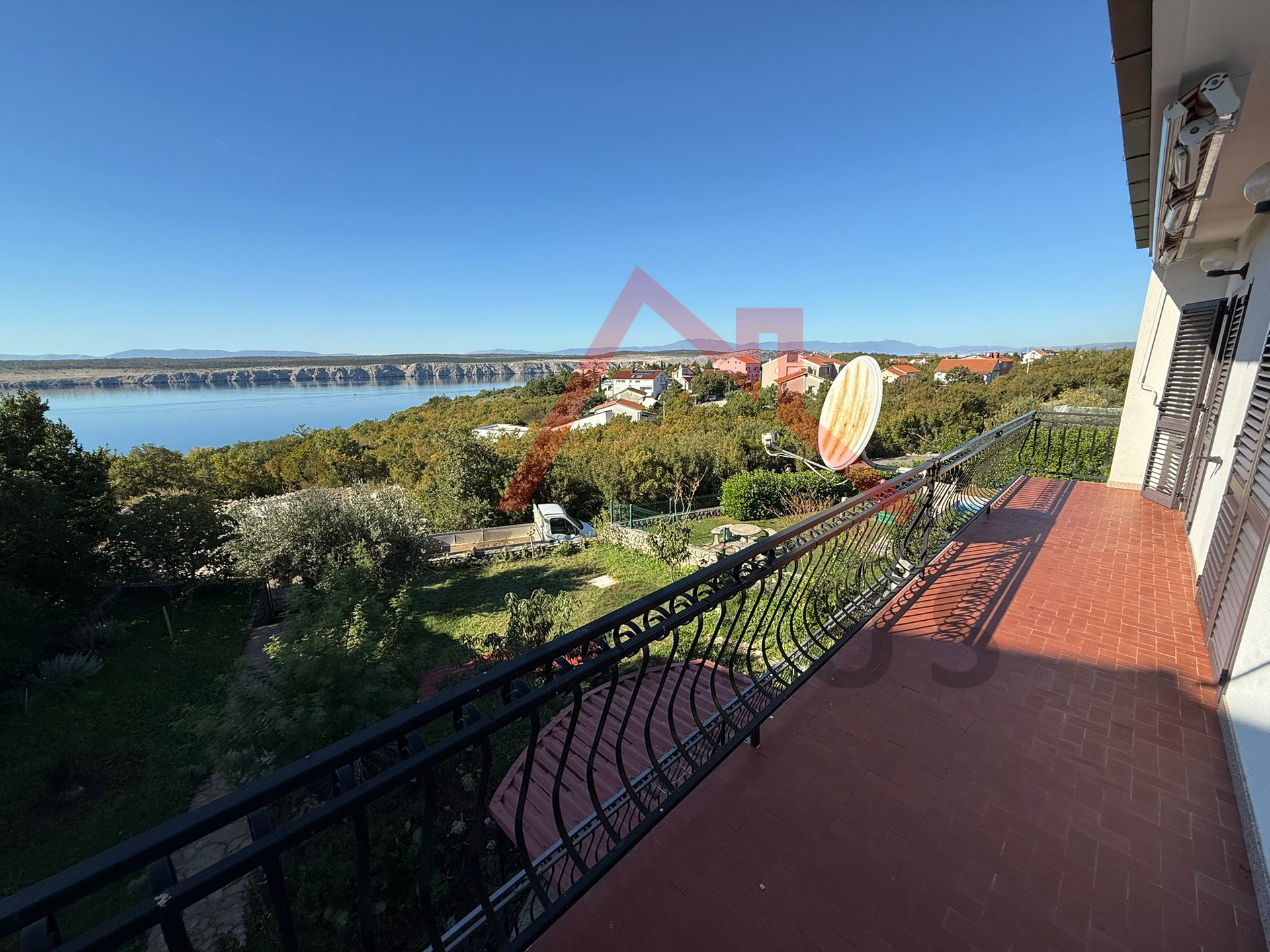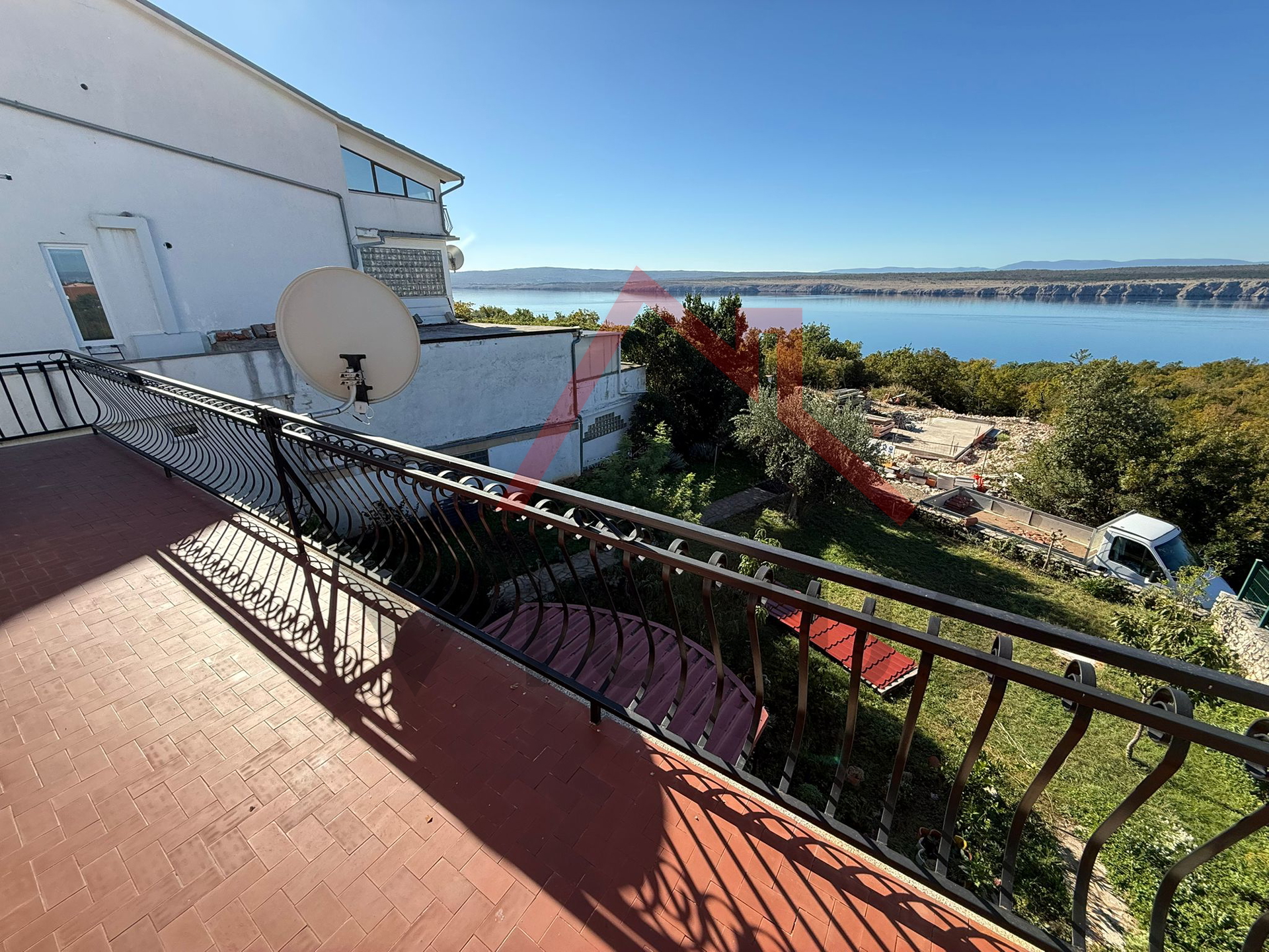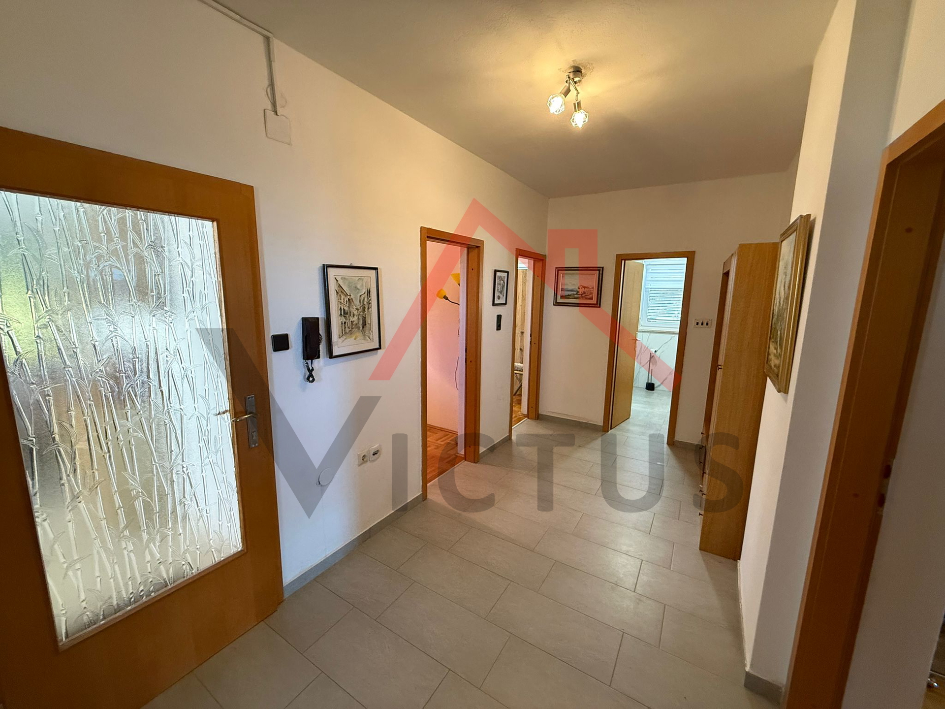 Stambene površine 230 m2, kuća se sastoji od suterena, prizemlja i kata. U suterenu se nalazi manji stan s jednom spavaćom sobom, kuhinjom s dnevnim boravkom i kupaonicom. U prizemlju i na katu se nalaze stanovi istog tlocrta, a koji se sastoje od hodnika, prostranog dnevnog boravka, kuhinje s blagovaonicom, tri spavaće sobe i dvije kupaonice. Oba stana imaju izlaz na prostrane terase, te su međusobno povezana unutarnjim stubištem i imaju zasebne ulaze. Sa terasa se pruža fantastičan otvoreni pogled na more. U prizemlju objekta se nalazi i garaža.