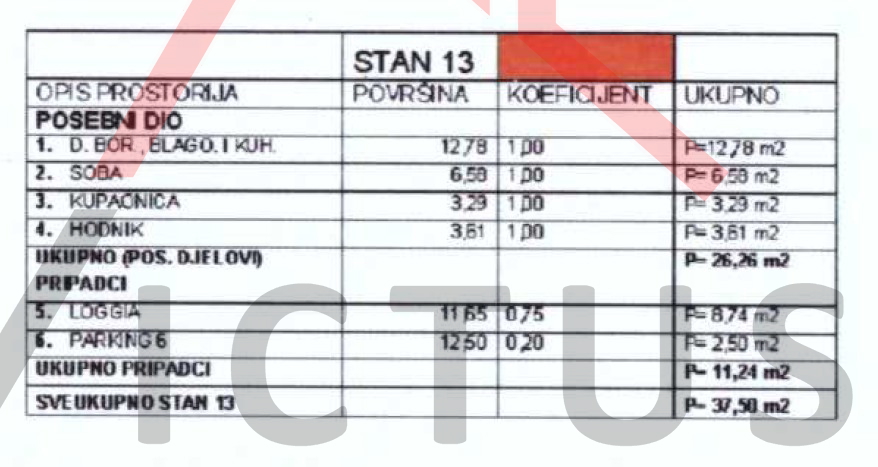 Stan se sastoji od dnevnog boravka s kuhinjom i blagovaonicom, spavaće sobe, kupaonice, te loggie površine 9 m2. Parkirno mjesto u vlasništvu od 12.50 m2