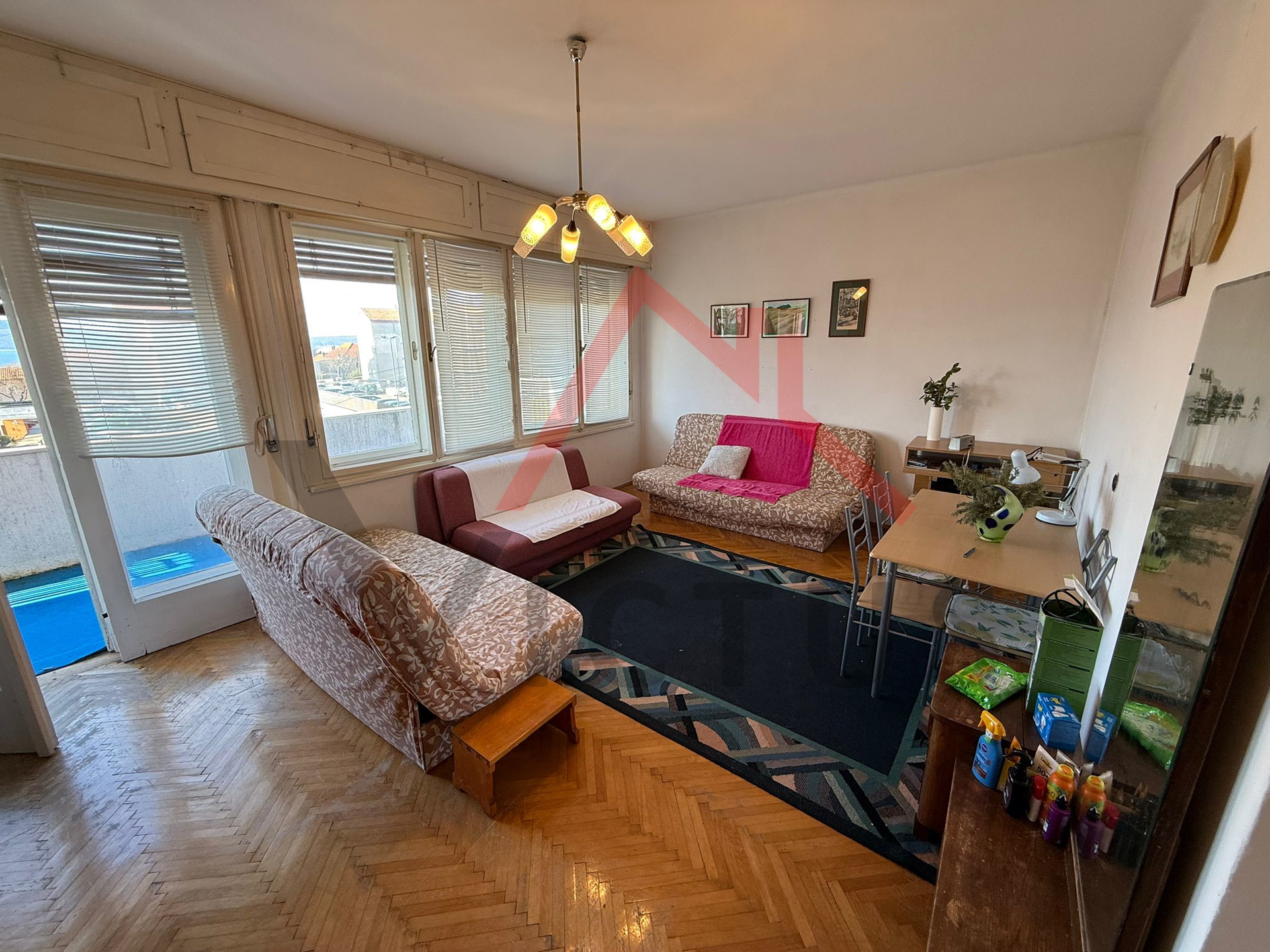 Stan se sastoji od hodnika, kuhinje, izbe, dnevnog boravka, spavaće sobe, kupaonice, WC-a i lođe. Pripada mu jedno parkirno mjesto unutar okućnice objekta, te drvarnica. Iz stana se pruža pogled na more i otok Krk. Stan zahtijeva renovaciju, no pruža mnogo mogućnosti za uređenje prema vlastitim željama radi svoga rasporeda i veće kvadrature.