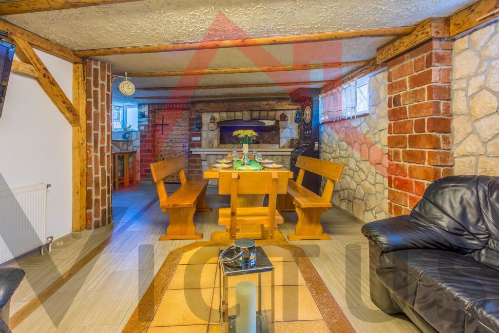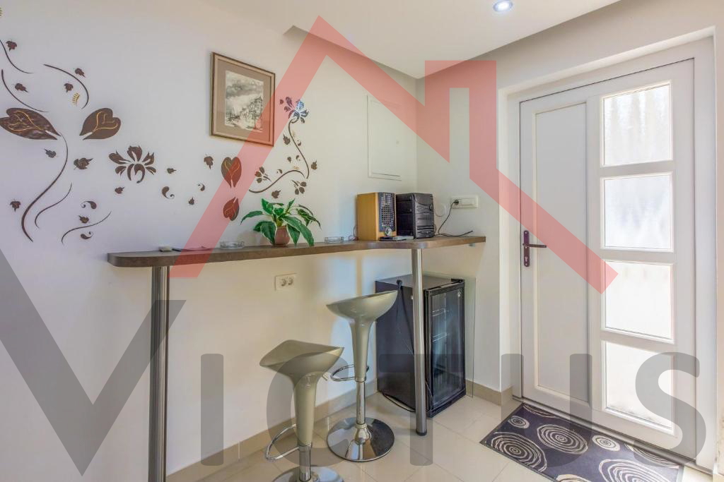 Kuća se sastoji od četiri sobe, dvije kuhinje, dvije kupaone, hodnika, krovne terase i fantastične konobe s kaminom koja je uređena i predviđena za boravak i druženje. Kuću krasi i krovna terasa za uživanje u prirodnim ljepotama i miru, idealna za ljubitelje prirode.
