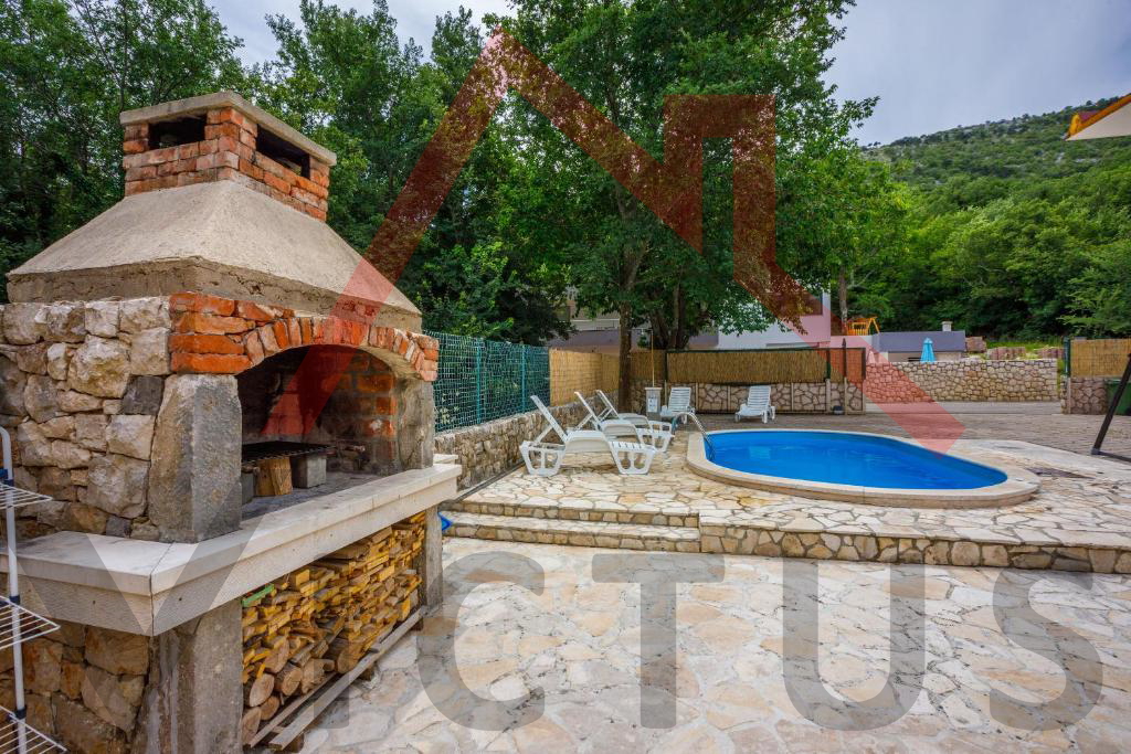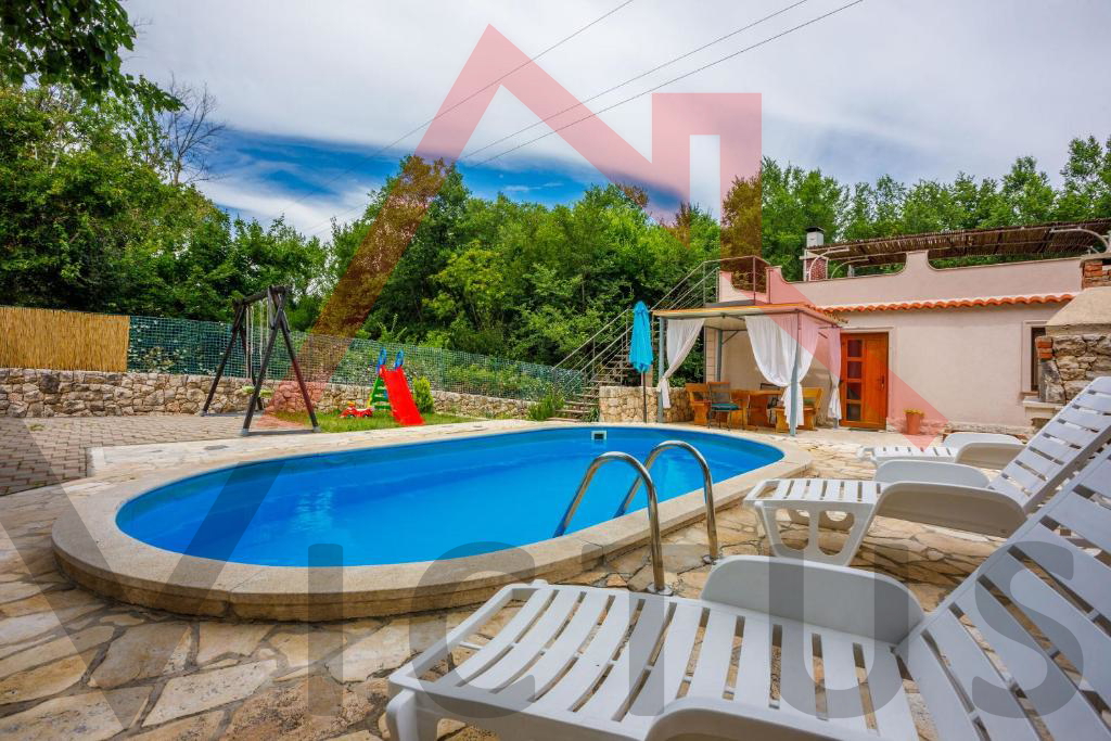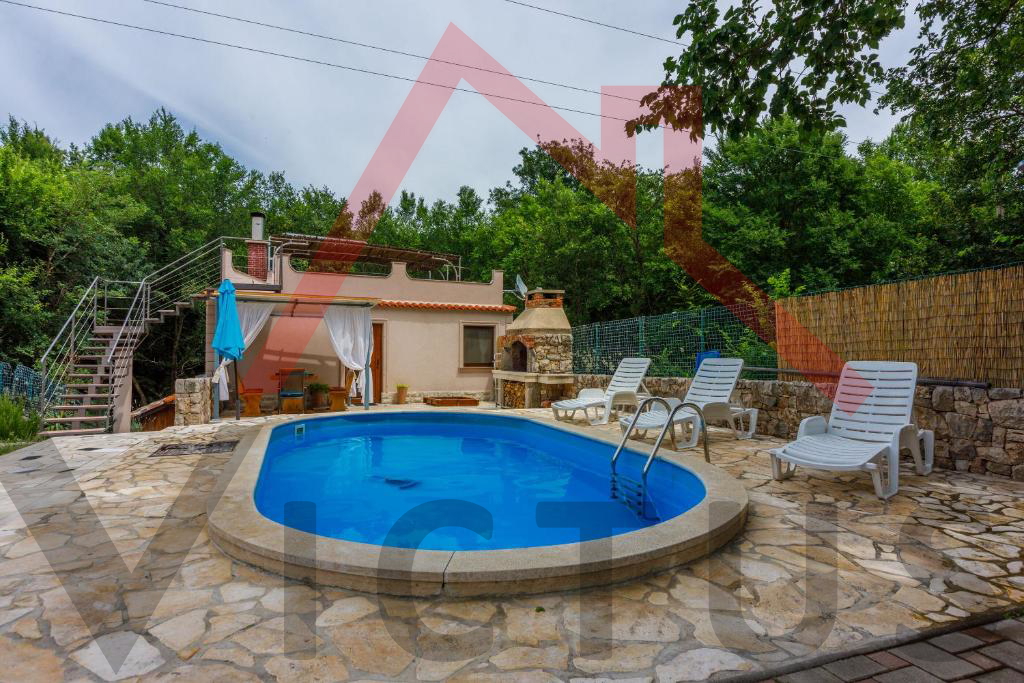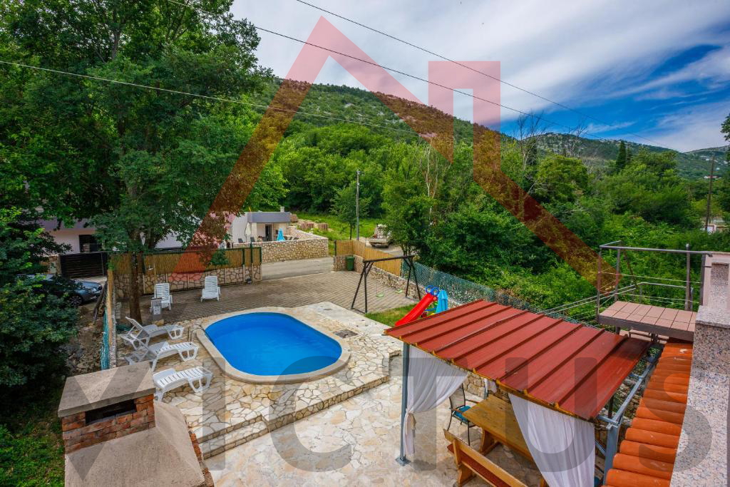 Na mirnoj lokaciji u Vinodolskoj općini, u Bribiru, prodaje se kompletno renovirana, opremljena i namještena kuća s bazenom i lijepo uređenom te ograđenom okućnicom.
