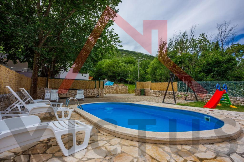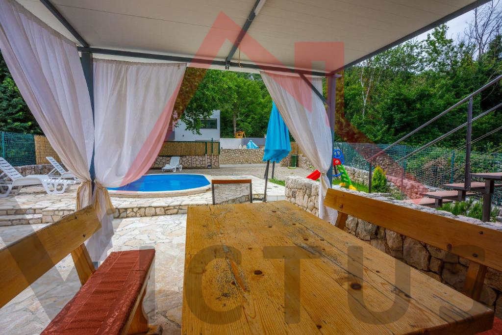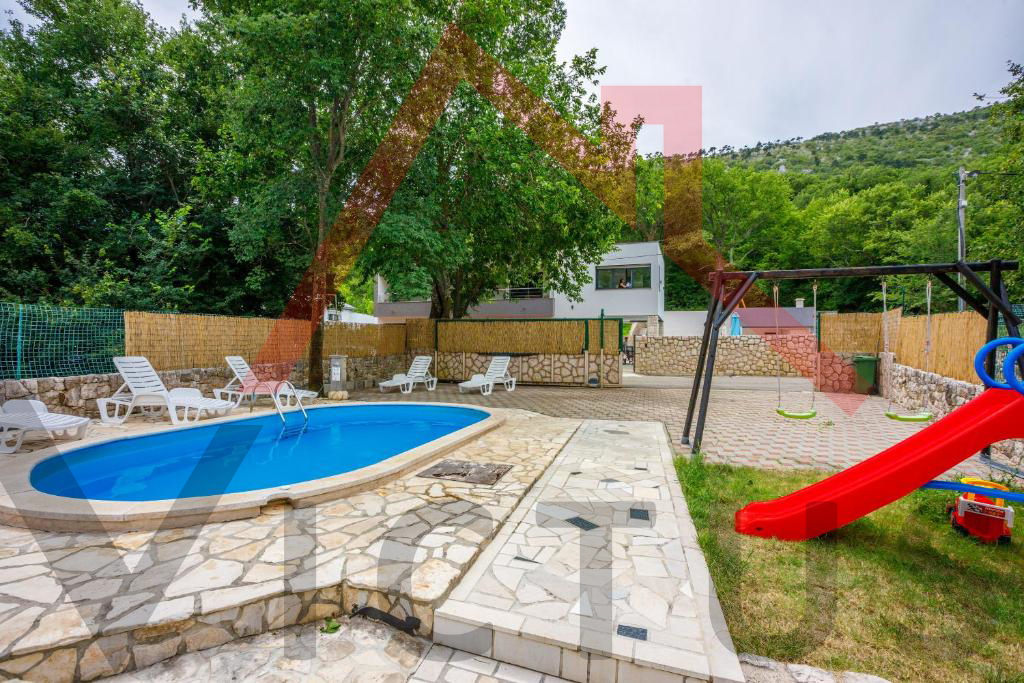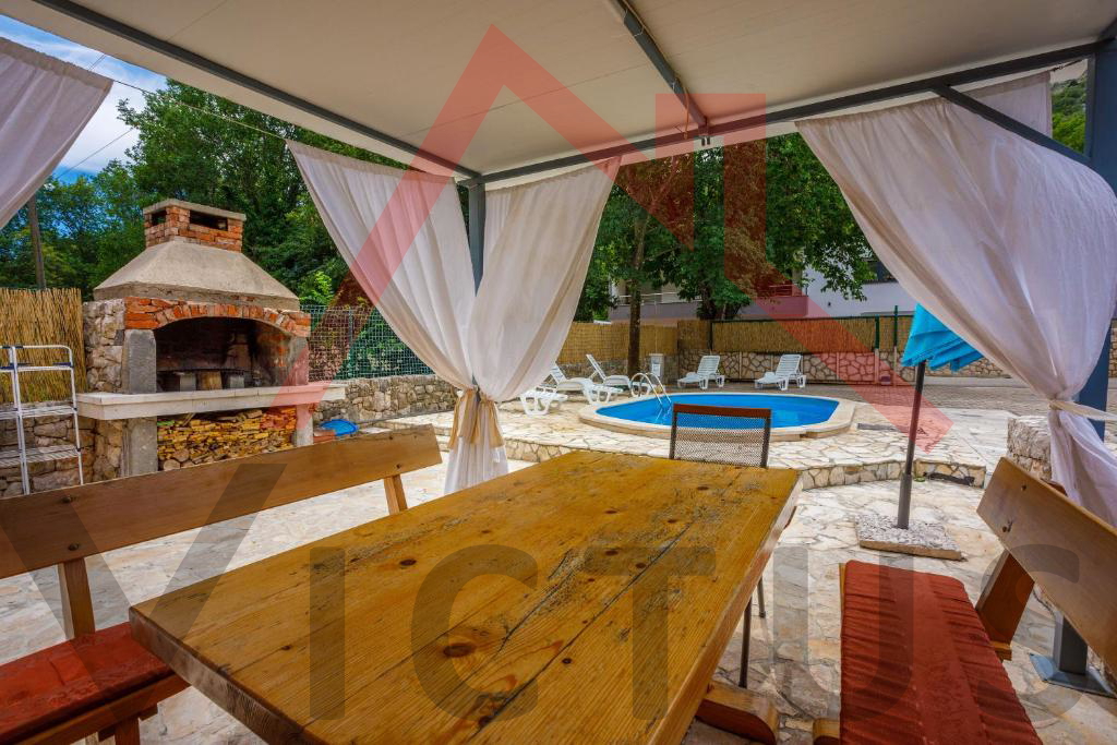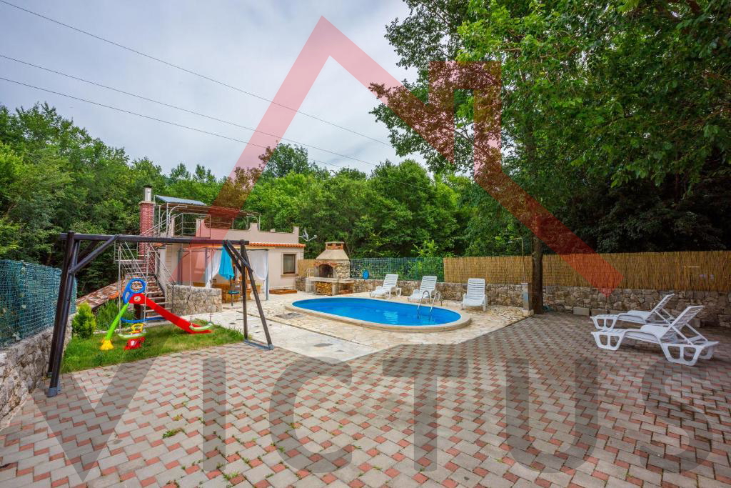 Na mirnoj lokaciji u Vinodolskoj općini, u Bribiru, prodaje se kompletno renovirana, opremljena i namještena kuća s bazenom i lijepo uređenom te ograđenom okućnicom.